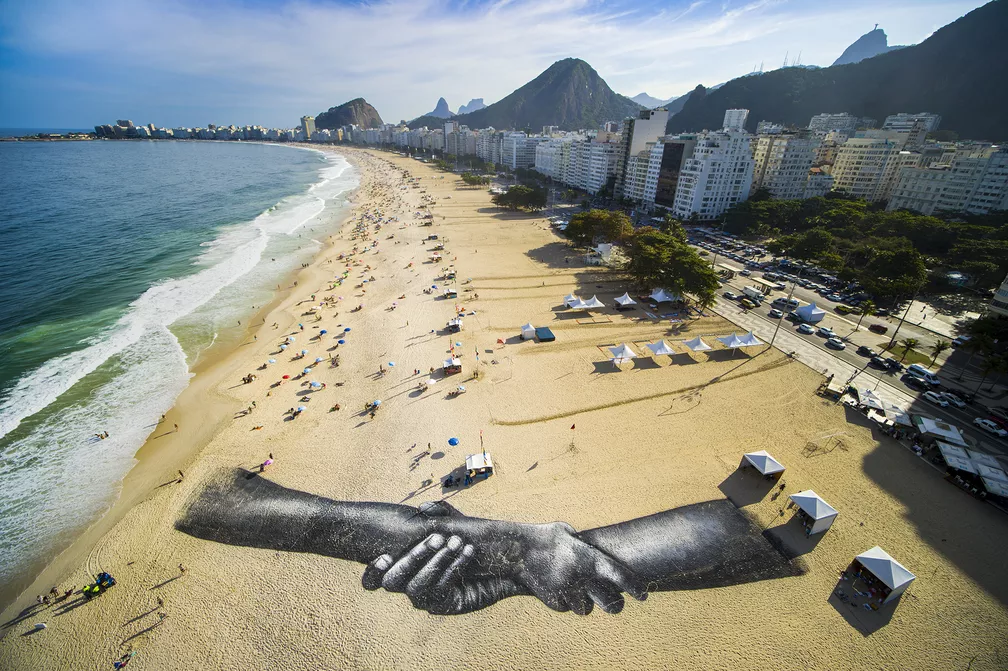 As areias da Praia de Copacabana passaram a fazer parte da “maior corrente humana do mundo”, nas palavras do artista francês Guillaume Legros, de 33 anos, o Saype — uma contração de Say Peace [diga paz, em tradução livre]. É pelas mãos dele que 30 cidades nos cinco continentes vão dar as mãos com megapinturas no chão… de mãos entrelaçadas.