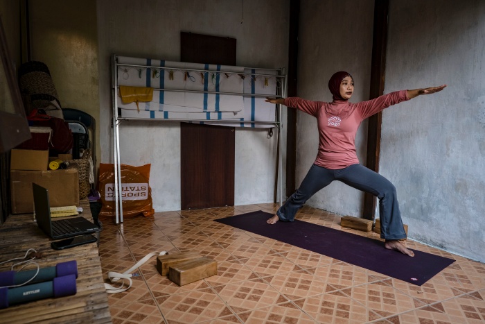 YOGYAKARTA, INDONESIA - APRIL 16: Yoga instructor, Dewi Amsari, teaching an online class from her home, as the government closed tourist destinations, schools, offices and urging citizens to work from home to curb the spread of the coronavirus on April 16, 2020 in Yogyakarta, Indonesia. Indonesian officials have so far confirmed over 5,500 cases of COVID-19 in the country with at least 496 recorded fatalities. The coronavirus (COVID-19) pandemic has spread to at least over 200 countries and territories across the world, claiming over 130,000 lives and infecting over a million more. (Photo by Ulet Ifansasti/Getty Images)