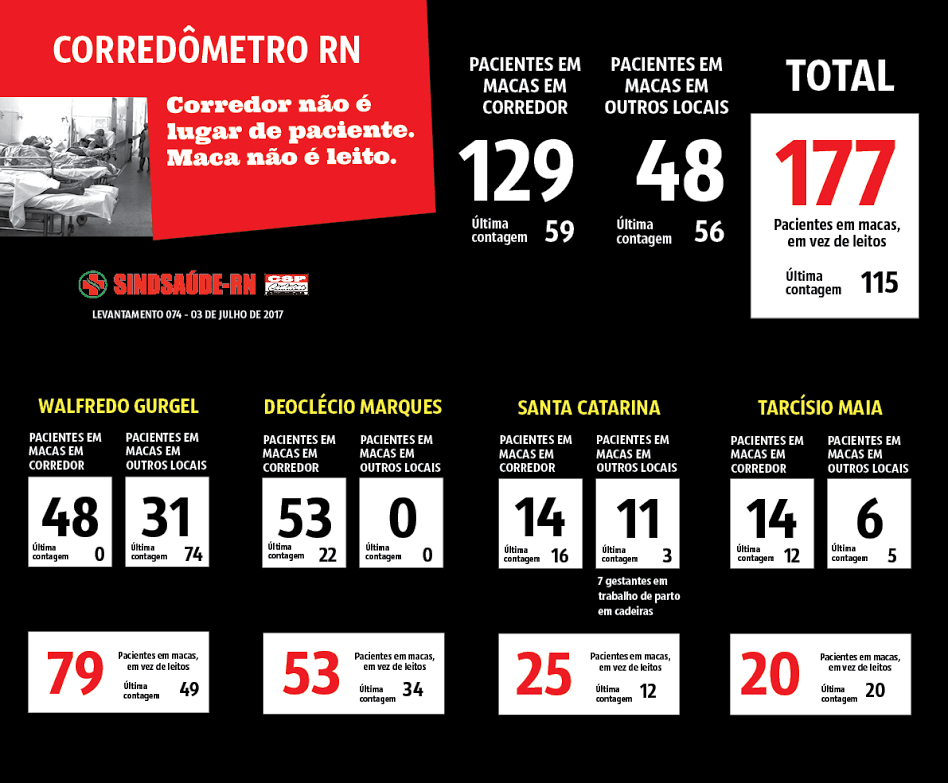 Na manhã de ontem (03), foi realizada a contagem dos pacientes que recebiam atendimento em macas nos corredores e em locais inadequados. Foi registrado um total de 177 pacientes em macas nos quatro maiores hospitais do estado: Walfredo Gurgel, Deoclécio Marques, Santa Catarina e Tarcício Maia.