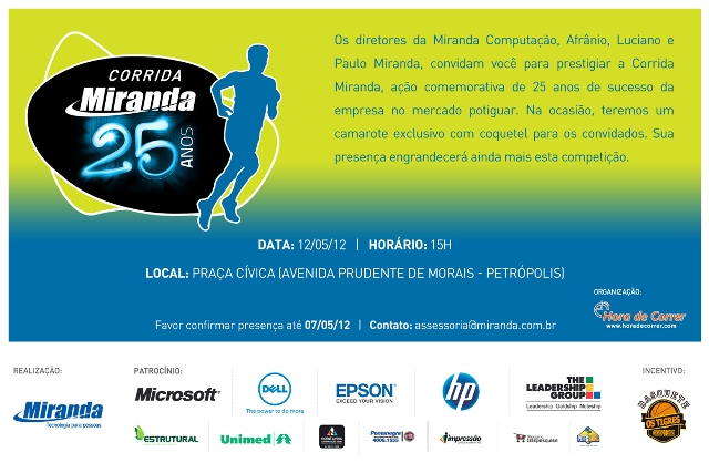 Neste ano a Miranda Computação comemora seus 25 anos no mercado potiguar e, no calendário de comemorações, a empresa prepara uma corrida de rua para o dia 12 de maio. Organizada pela Hora de Correr, a Corrida Miranda 25 anos, contará com provas de 5 e 10Km e largada e chegada na Praça Cívica de Natal, na Avenida Prudente de Morais, iniciando às 15h.