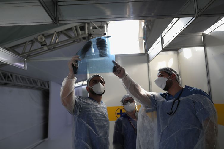 Médicos observam exame de paciente em hospital de campanha em Guarulhos (SP) 12/05/2020 REUTERS/Amanda Perobelli