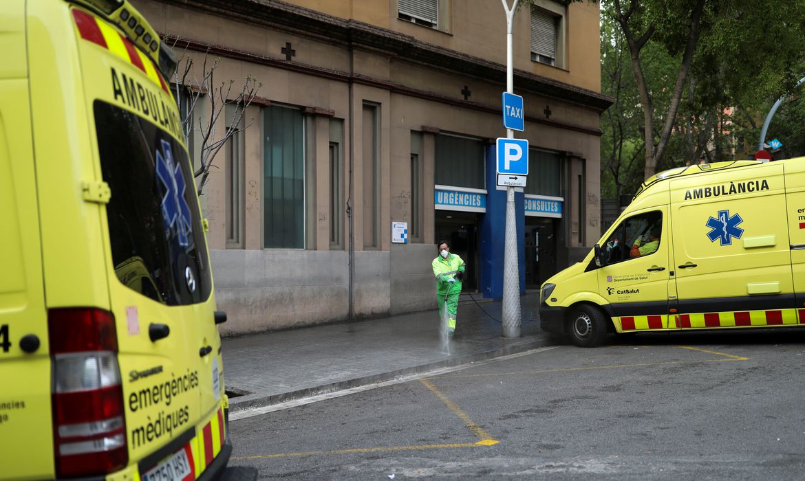 Um trabalhador lava a rua do lado de fora de uma unidade de emergência médica durante o surto de doença por coronavírus (COVID-19), em Barcelona, Espanha, em 7 de abril de 2020. REUTERS / Nacho Doce
