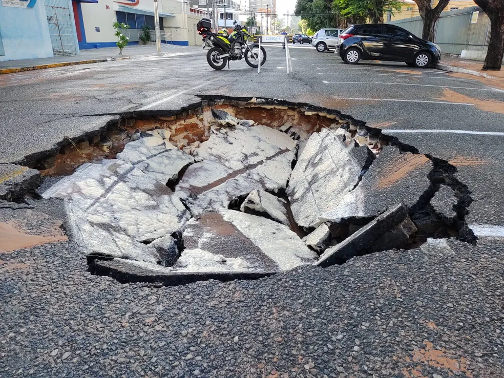 O asfalto cedeu pouco antes das 7h por causa de um vazamento de água percebido ainda nas primeiras horas da manhã no bairro Tirol, Zona Leste da cidade.