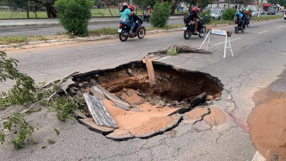 A abertura foi causada por um vazamento na tubulação de água da Companhia de Águas e Esgotos do Rio Grande do Norte (Caern), que sinalizou o trecho e enviou equipes ao local ainda durante a manhã.