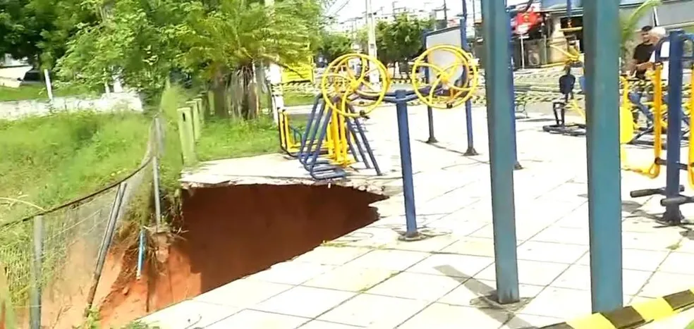 Uma cratera se abriu durante a madrugada deste sábado (8) em um calçadão próximo à lagoa de captação Nezinho Alves, na Avenida Abel Cabral, em Nova Parnamirim, na Grande Natal. A área que também conta com uma Academia da Terceira Idade foi isolada.