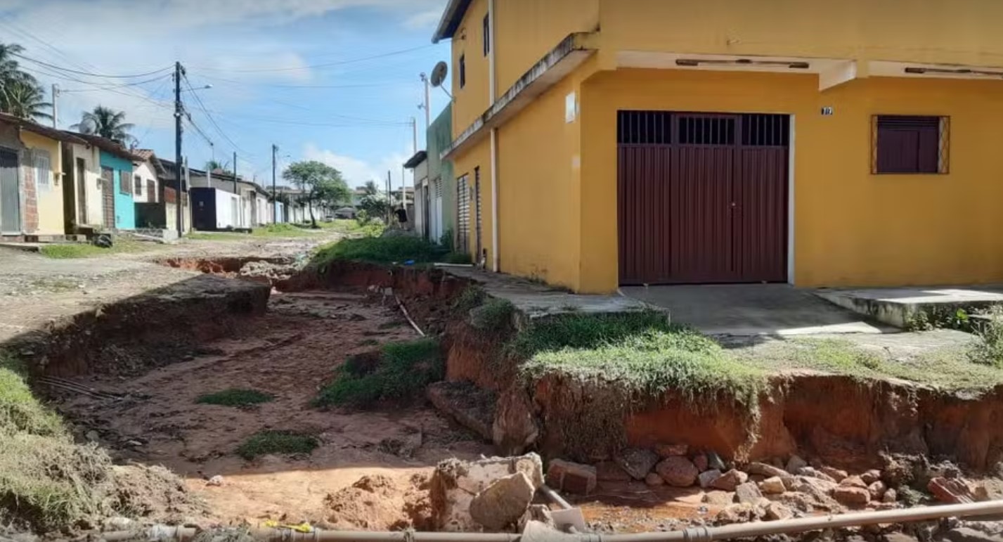 Na Rua Poeta Homero Homem, no bairro Pajuçara, a força da água causou uma erosão que abriu uma cratera ao lado de uma casa.