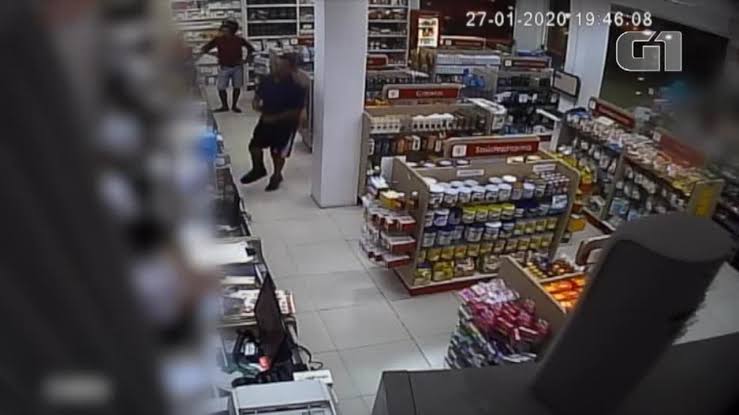 Os dois homens armados chegaram no local em uma moto preta. Primeiro, um deles entrou na farmácia com um capacete na cabeça. O outro criminoso entrou na farmácia depois pulando em um pé só e foi até um balcão. Ele saca uma arma e anuncia o assalto.