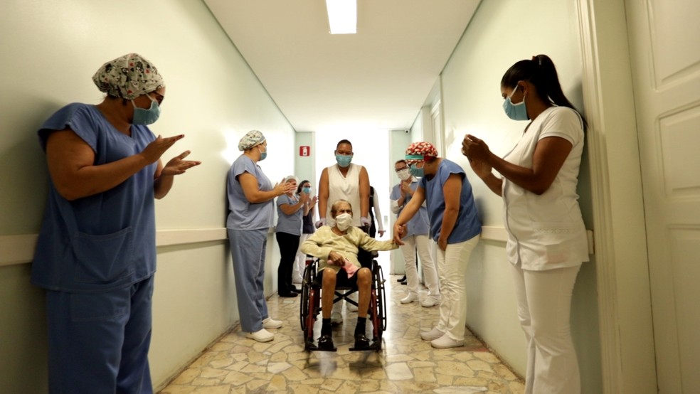 Uma idosa de 90 anos que havia sido diagnosticada com o novo coronavírus recebeu alta hospitalar em Olímpia (SP). Dona Maria ficou internada na Santa Casa por 10 dias e foi aplaudida por funcionários e profissionais da saúde ao sair da unidade na segunda-feira (11).