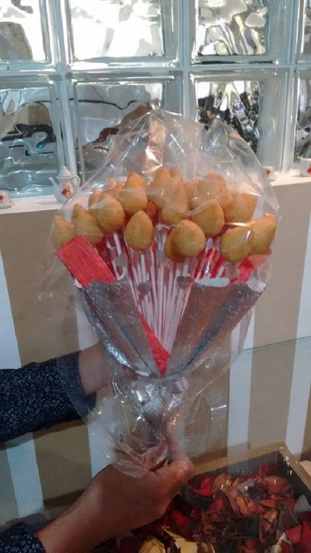 Uma paranaense parece ter criado um presente que é praticamente à prova de erro: o buquê de coxinha. A ideia chegou a Dircilene Ventura, moradora de Curitiba, graças a seu filho, Eduardo, que queria presentear a namorada com um buquê, seguindo um desejo dela, que tinha visto uma brincadeira sobre o tema na internet. Sua mãe se dispôs a criar o presente, e fez sucesso instantâneo.