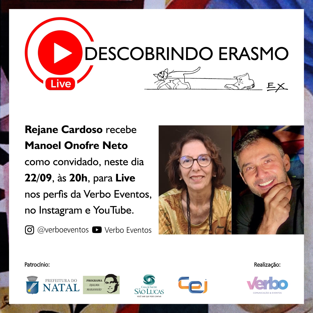 Esta será a primeira de uma série de três lives com tema Descobrindo Erasmo, que vão anteceder o lançamento do livro A Arte Modernista de Erasmo Xavier, de autoria de Rejane Cardoso, sobrinha do cartunista. A jornalista e o convidado vão conversar sobre como ele, sendo tão jovem e de uma geração que não teve contato com pessoas ligadas a Erasmo, conheceu e se apaixonou pelo trabalho do artista.