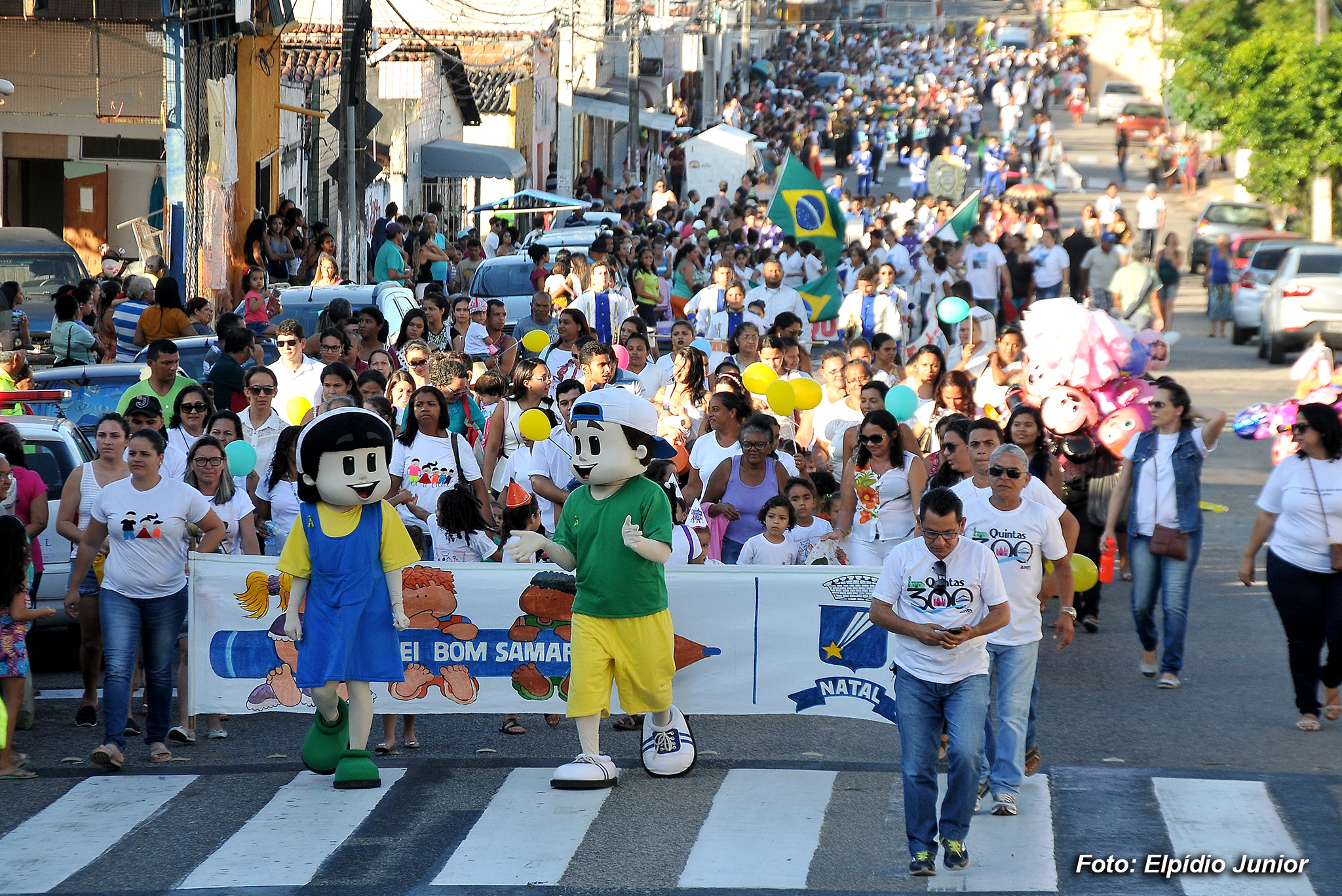 Aconteceu ontem o desfile cívico em comemoração aos 300 anos do bairro das Quintas, na zona Oeste da nossa cidade. A programação se inciou na última quinta-feira, 31, marcando o aniversário do bairro, que foi o segundo instituído na cidade de Natal. O desfile contou com a participação de várias escolas do bairro, todas com bandas marcial, além dos mascotes Edu e Cidinha, da campanha Setembro Cidadão. Amanhã será realizado o Torneio de Futsal Interescolar, a partir das 9h, na quadra da Escola Municipal Professor Ferreira Itajubá, Cento e cinquenta alunos da rede pública de ensino da região vão disputar o campeonato.