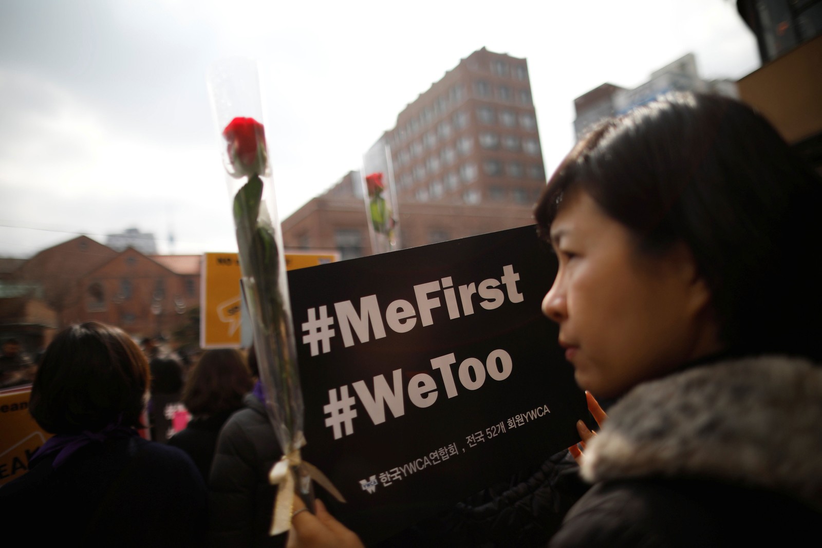 Centenas de sul-coreanas fizeram uma passeata e se reuniram na praça de Gwanghwamun, em Seul, aos gritos de “Me Too” (“Eu também”, em inglês) em referência à campanha que começou em Hollywood para denunciar abusos sexuais.