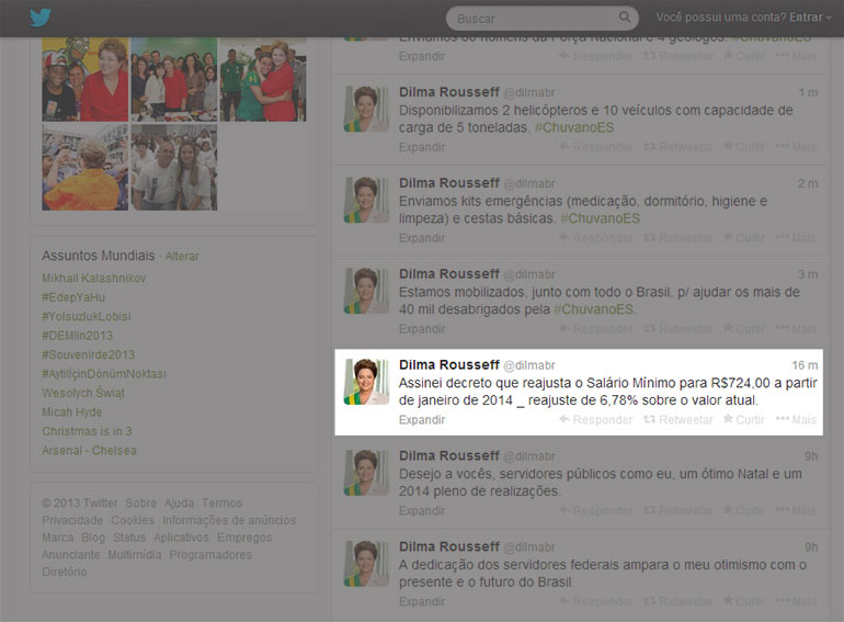 A presidenta Dilma Rousseff confirmou ontem (23) o aumento do salário mínimo para R$ 724 em 2014, 6,78% a mais do que os R$ 678 atuais. Em uma publicação na rede social Twitter no final da tarde desta terça-feira, a presidenta informou que assinou o decreto que viabiliza o ajuste. Esse valor estava previsto no orçamento da União, aprovado pelo Congresso na semana passada. Ao comemorar a aprovação, Dilmadisse que Executivo e Legislativo têm estabelecido uma relação “muito construtiva” e que o Congresso tem sido um “grande parceiro” do governo.