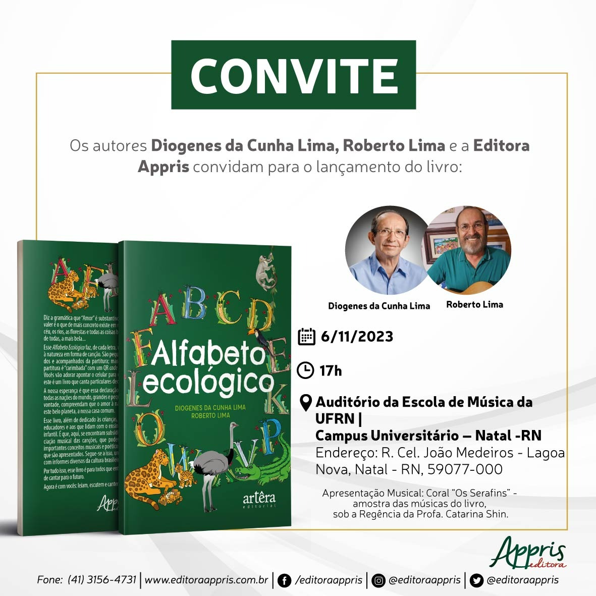 Na próxima segunda-feira (06) os autores Diogenes da Cunha Lima, Roberto Lima lançam o livro “Alfabeto Ecológico”, pela Editora Appris, às 17h no Auditório da Escola de Música da UFRN.