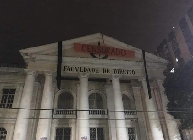 Na quarta-feira (24), os estudantes da Universidade Federal Fluminense (UFF) fizeram uma manifestação contra a ação de fiscais do TRE-RJ, que estiveram na universidade na terça-feira (23) para a retirada da fachada do prédio de bandeira com a frase “Direito UFF Antifascista”.