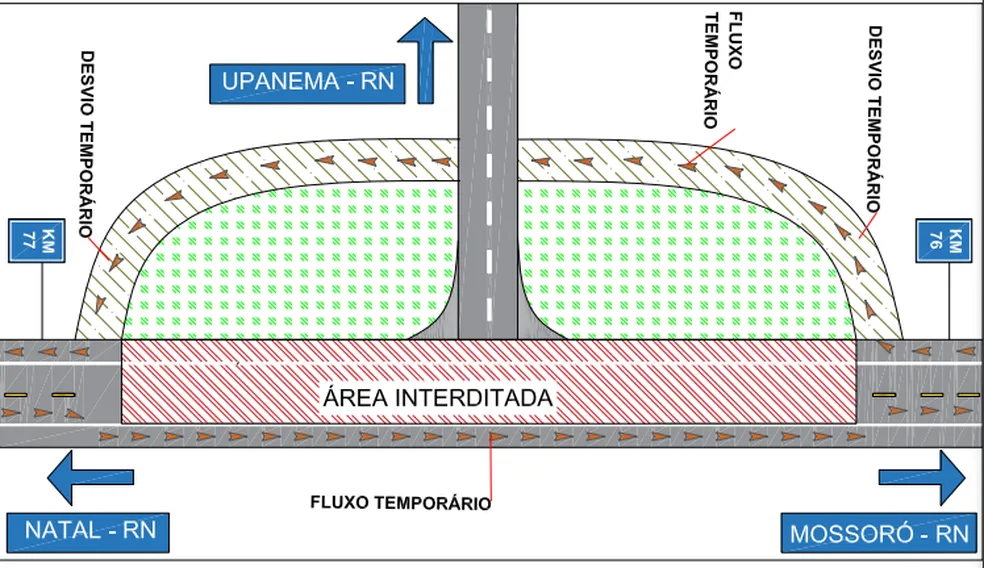 No sentido Mossoró-Natal, os veículos serão desviados para a faixa de domínio à direita. No sentido oposto, o tráfego será deslocado para o acostamento existente.