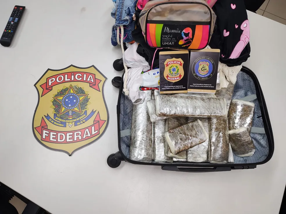 Uma dona de casa de 24 anos foi presa na tarde desta quinta-feira (7) no Aeroporto de Natal com 3,3 quilos de maconha escondidos na mala e na própria roupa do corpo.