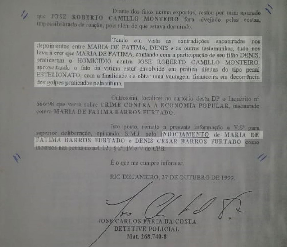 No documento, o detetive policial José Carlos Faria da Costa constata contradições nos depoimentos de Denis e Maria de Fátima, e pede o indiciamento dos dois pelo homicídio. O texto é assinado em 27 de outubro de 1999, mais de dois anos após o crime.
