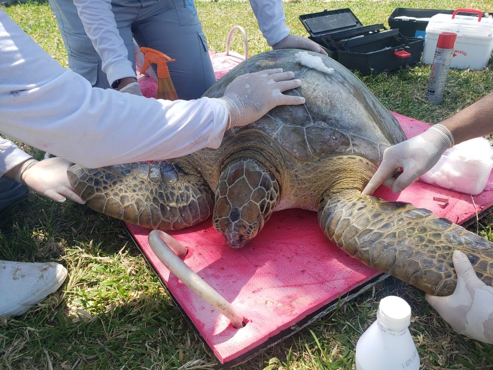 A tartaruga é uma fêmea com 83,5 cm por 79,5 e, de acordo com os pesquisadores, estava com um bom estado de saúde e muito ativa. Após a avaliação, ela foi anilhada e solta na praia da Via Costeira.