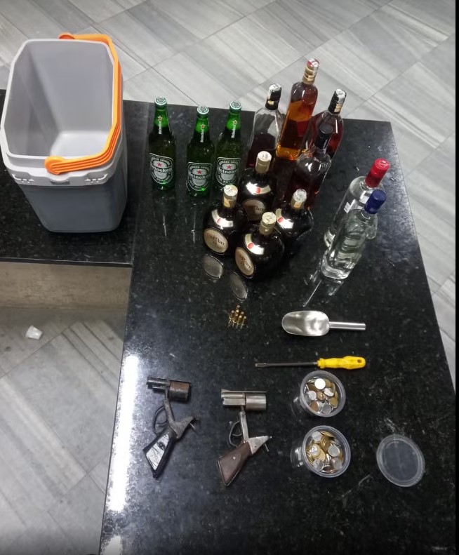 Os dois homens arrombaram o restaurante e começaram a coletar bebidas alcoólicas, colocando as garrafas em uma caixa térmica que também pertencia à empresa. Moedas que estavam na caixa registradora também foram retiradas do local.
