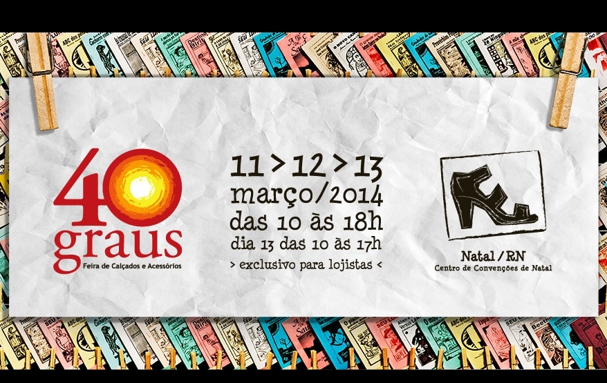 A 40 Graus – Feira de Calçados e Acessórios chega à sua segunda edição aproximando as principais marcas brasileiras de algumas das principais redes varejistas. Focado nos mercados das regiões Norte e Nordeste, o evento cresceu mais de 20% em expositores nesta edição, realizada nos dias 11, 12 e 13 de março de 2014, das 10h às 18h. Serão cerca de 40 novas empresas que irão ampliar ainda mais o mix de produtos oferecidos no Centro de Convenções de Natal, no Rio Grande do Norte.