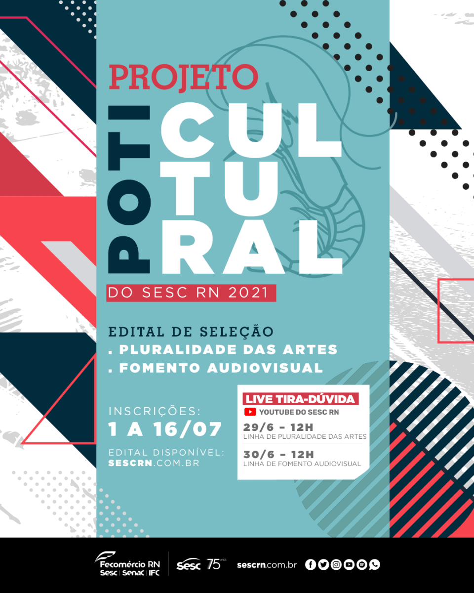 O Serviço Social do Comércio RN (Sesc RN), entidade do Sistema Fecomércio, lançou o edital de seleção de propostas digitais para o projeto Poti-Cultural 2021. Neste ano, serão investidos R$ 264 mil em duas linhas: uma de Fomento ao Audiovisual e outra de Pluralidade das Artes. As inscrições seguem até o dia 16 de julho de 2021, com edital disponível no site: sescrn.com.br.