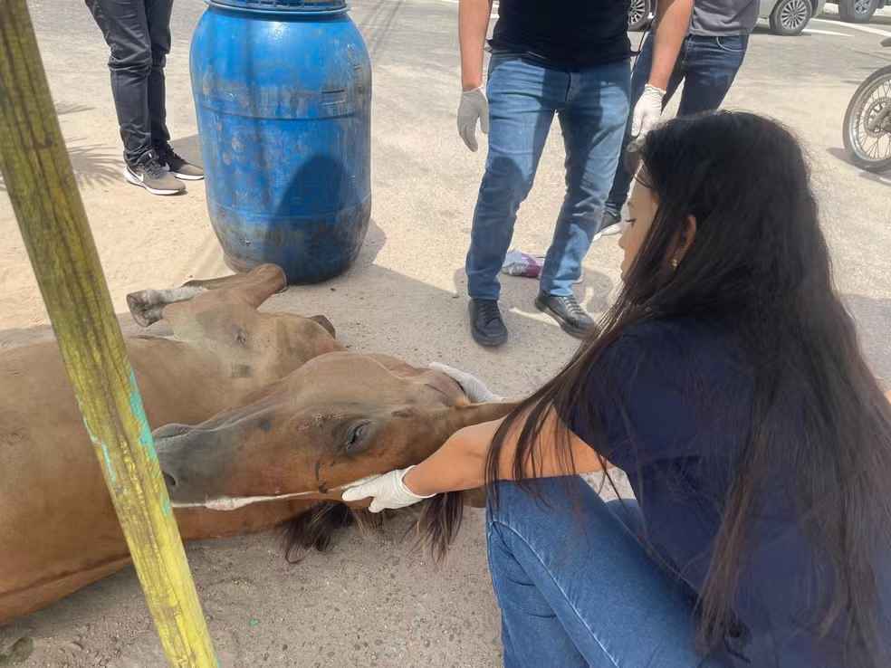 Logo após o acidente, os veterinários conseguiram acalmar o animal e hidratá-lo. A égua foi colocada na carroceria com a ajuda de pessoas que estavam na região antes de seguir para o Curral Municipal.