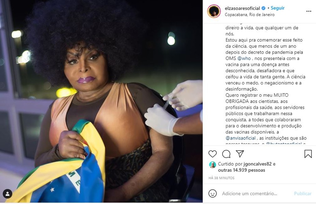 A cantora Elza Soares, de 90 anos, foi vacinada nessa sexta-feira (5) no Rio. Em sua página no Instagram, ela postou uma mensagem celebrando a imunização e a vitória da “ciência”.
