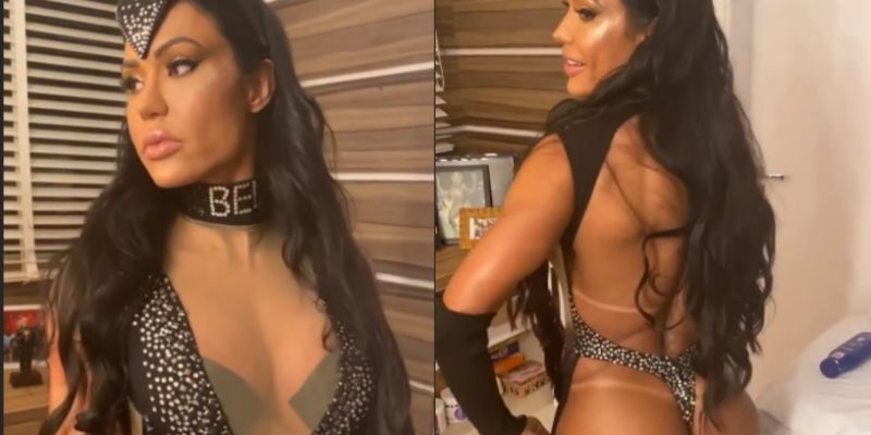 “O Baile da Arara está homenageando as rainhas e musas das décadas de 80 e 90 e eu estou homenageando a nossa eterna rainha Luma de Oliveira com uma mistura da rainha atual, rainha do Brasil, Anitta. Botei só essa calça e deixei a bunda de fora, como a Anitta faz, e ficou maravilhosa. Coloquei para tapar meus machucados. Não aguento andar sem curativo aqui. A gente fez um truque, uma homenagem meio misturada”, disse ela.