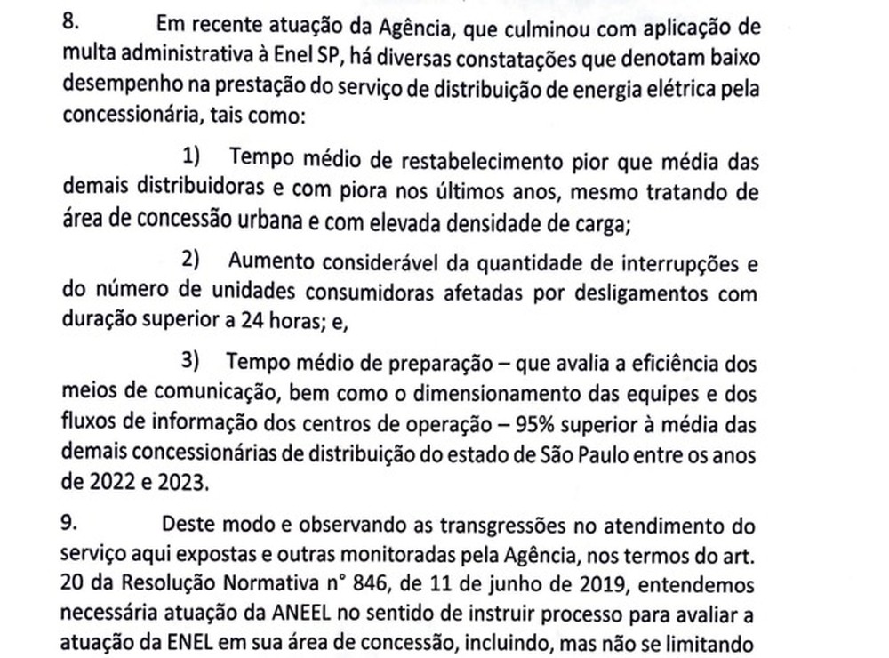 Na carta, ele diz ainda que o tempo médio de atendimento da Enel é 95% maior que a média das demais distribuidoras do estado de São Paulo nos anos de 2022 e 2023.