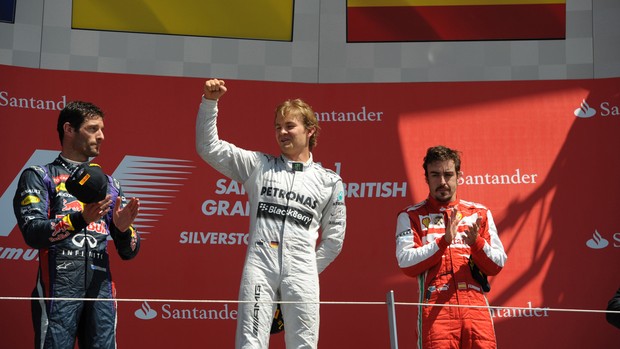 Pneus furados, quebras, detritos na pista, duas entradas de safety car. Com “santo forte”, Nico Rosberg passou ileso a um GP da Inglaterra recheado de incidentes e, como “brinde”, conquistou a vitória em Silverstone, seu segundo triunfo na temporada, o terceiro na carreira. O alemão da Mercedes foi beneficiado por problemas com Lewis Hamilton e Sebastian Vettel, ambos quando lideravam. O britânico da Mercedes sofreu com um furo de pneu logo no início da prova, enquanto o alemão da RBR teve problemas no câmbio na parte final e abandonou. Mark Webber e Fernando Alonso completaram o pódio na movimentada prova.