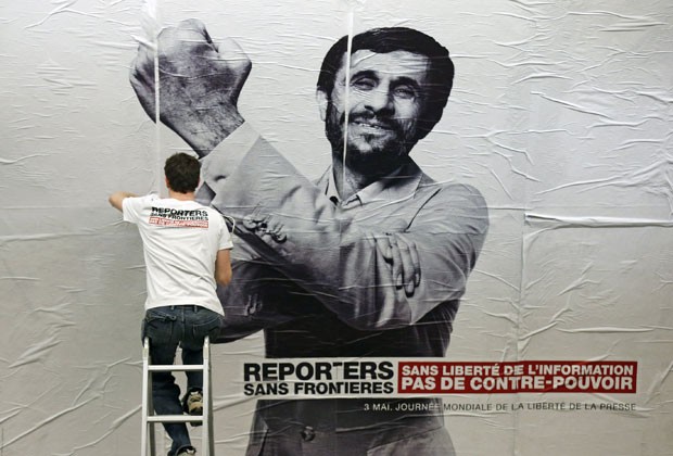Nesta sexta-feira (3), ativistas da organização defensora da liberdade de expressão Repórteres sem Fronteiras (RSF) espalharam em Paris, na França, montagens de fotos de presidentes de países nos quais o trabalho dos jornalistas já sofreu restrições, como Síria, Rússia, Coreia do Norte e Irã. A campanha faz parte das comemorações do dia mundial da liberdade de imprensa, celebrado hoje. O slogan deste ano é “sem liberdade de informação, nenhum contra-poder.”