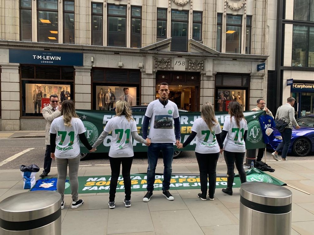 O zagueiro Neto e as viúvas de quatro jogadores da tragédia aérea da Chapecoense se reuniram nesta segunda-feira (30) em frente às sedes da corretora de seguros Aon e da seguradora Tokio Marine Kiln, em Londres, para protestar pela falta de indenização pela queda do avião, que vitimou 71 pessoas em novembro de 2016.
