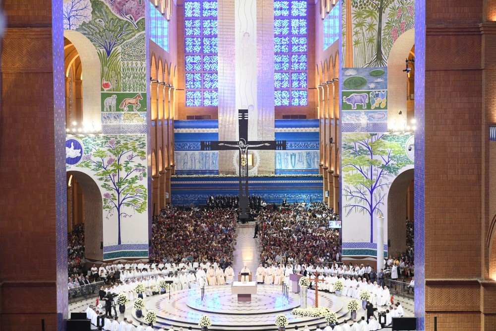 Viemos ao Santuário para proclamar todas essas vidas no poder de Jesus ressuscitado e da Rainha do Brasil. Em Caná da Galileia o grande mandamento da vida do Evangelho, da vida bíblica: fazei tudo o que ele vos disser. Seu mandamento último porque a última palavra de Nossa Senhora dos Evangelhos é um mandamento: fazei, praticai, observai a palavra do meu Filho. Antes de tudo, o Evangelho. Primazia do Evangelho.