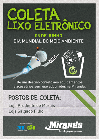 Segundo ele, o objetivo é promover um descarte adequado para produtos eletrônicos quebrados ou inutilizáveis adquiridos na Miranda de forma que haja uma reciclagem ou reaproveitamento deste material para doação. “Estaremos recolhendo o lixo gerado pela nossa empresa. A intenção é poder contribuir com o meio ambiente dando uma destinação correta a estes produtos que são compostos por substâncias agressivas ao meio ambiente como o chumbo. Será um dia de oportunidade para que os clientes depositem seus eletrônicos sem serventia comprados nas lojas da rede Miranda”, explica. O montante recolhido será destinado para uma empresa prestadora de serviço de coleta, transporte e destinação final de resíduos sólidos recicláveis. No ano passado, a Miranda arrecadou 143Kg de equipamentos eletrônicos nesta mesma ação.