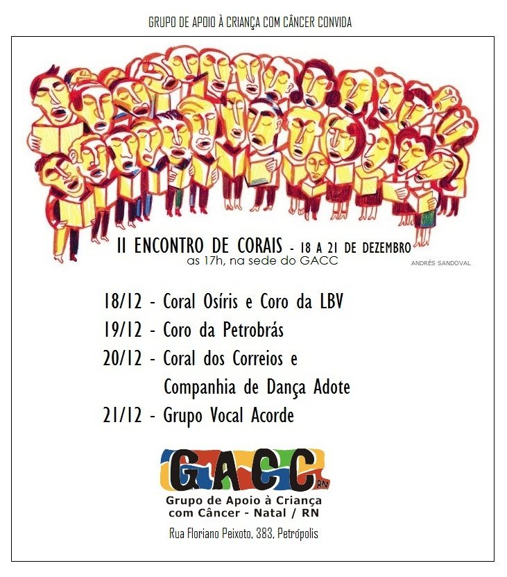 Em celebração à semana do Natal e para alegrar a entrega dos presentas das crianças assistidas pela instituição, o GACC recebe quatro apresentações de corais na sua sede. Dia 18 se apresentará o Coral Osíris e LBV, dia 19 o Coral da Petrobrás, dia 20 será a vez do Coral dos Correios e Companhia de Dança Adote e dia 21 o Grupo Vocal Acorde. Além do embalo musical outras atividades lúdicas acontecerão durantes esses dias. As apresentações serão a partir das 15h na sede da instituição.
