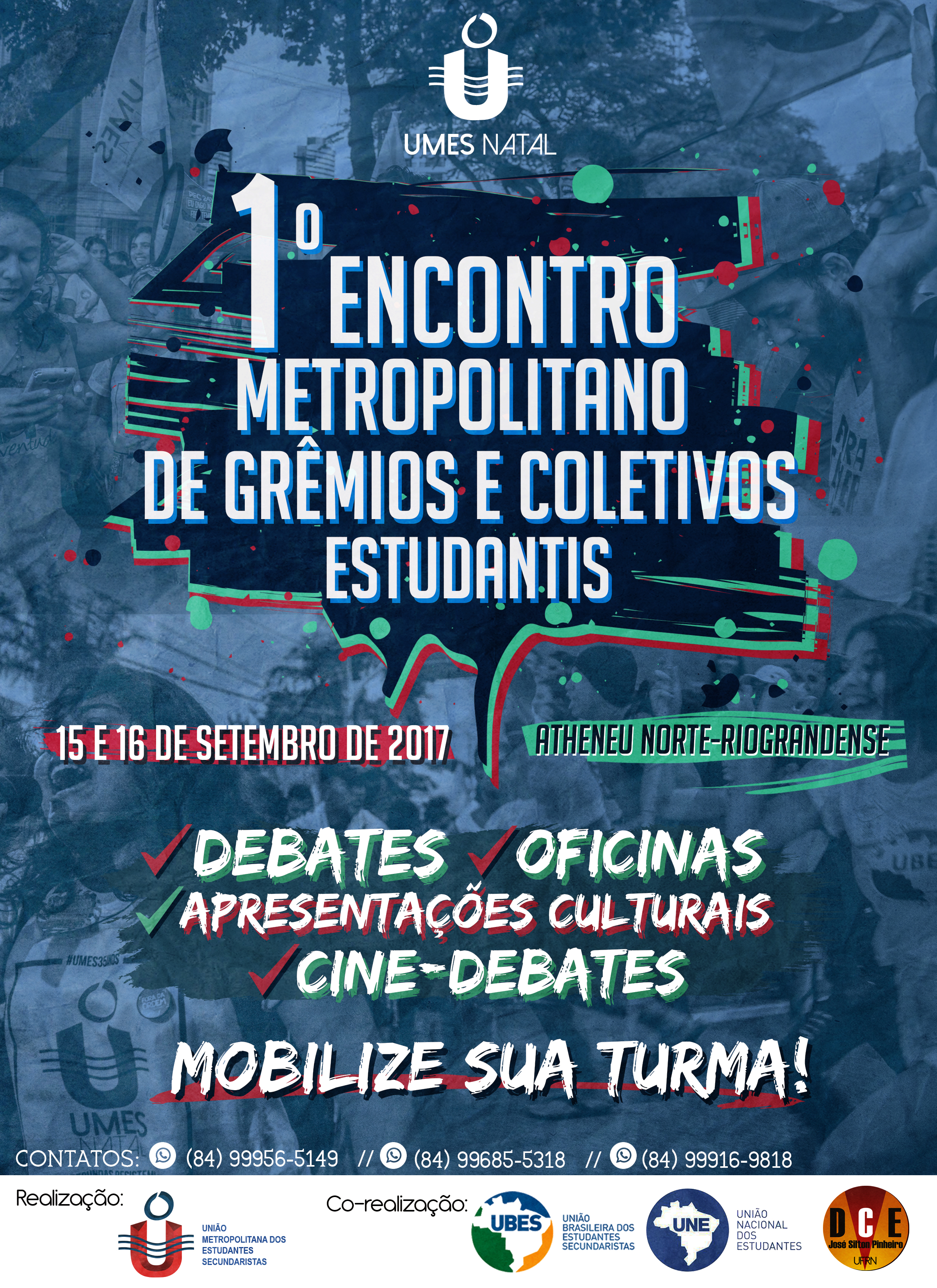A União Metropolitana dos Estudantes Secundaristas (UMES NATAL) realiza, nos dias 15 e 16 de setembro, o 1° Encontro Metropolitano de Grêmios e Coletivos Estudantis. A atividade pretende reunir cerca de 400 jovens do ensino médio, fundamental e técnico, de várias regiões do Estado, no Atheneu Norte-Riograndense, com o objetivo de possibilitar o diálogo sobre temas que envolvem educação, democracia, cultura e movimento estudantil.
