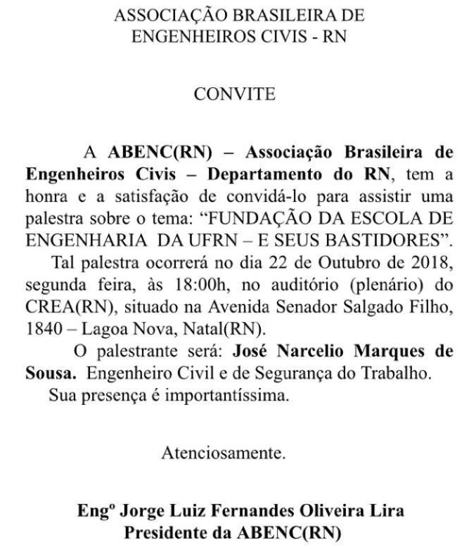 Nesta segunda-feira (22), a Associação Brasileira de Engenheiros Civis, do Departamento do RN (ABENC-RN), receberá a palestra do engenheiro civil e de segurança do Trabalho, José Narcelio Marques de Sousa, que falará sobre a fundação da escola de engenharia da UFRN e seus bastidores, às 18h no auditório (plenário) do CREA-RN, na Avenida Senador Salgado Fillho 1840, no bairro de Lagoa Nova.