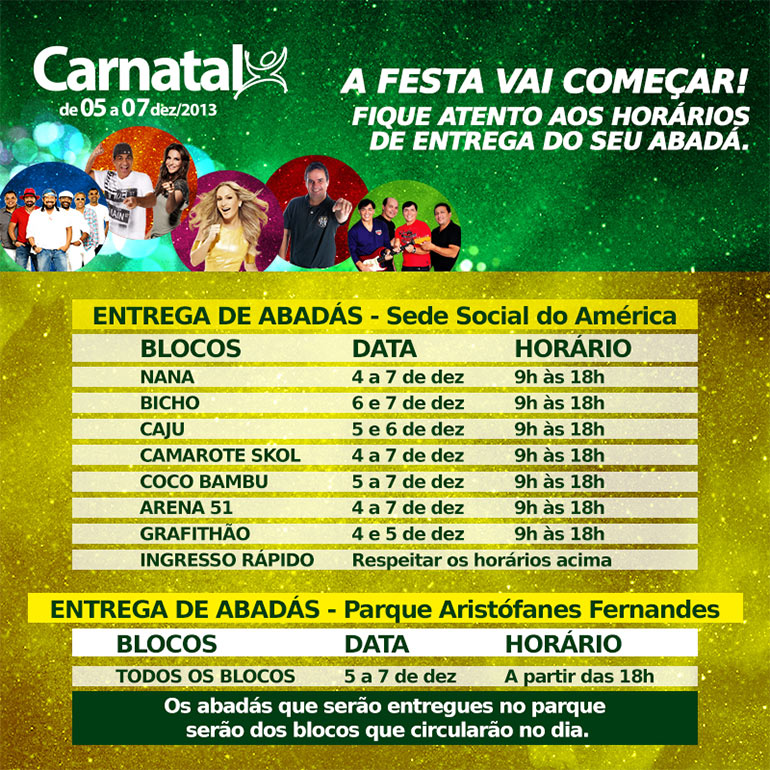 A semana será de micareta para os foliões do Carnatal. A programação oficial começa na quarta-feira (4) com o início da entrega dos abadás da folia no Parque Aristófanes Fernandes, local da micareta. O horário de entrega é das 9h às 18h. A entrega dos abadás continua até o dia 7 de dezembro, último dia da folia com apresentação dos blocos Nana, Camarote Skol e Arena 51.