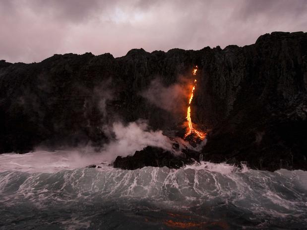 Ondas quebram sobre a lava que flui para o oceano durante erupção no Parque Nacional Vulcões de Kalapana, no Estado americano no Havaí. Um vulcão do parque entrou em erupção e autoridades locais esperam que o “raro e espetacular” fenômeno da fusão entre o vapor e as ondas se prolongue para atrair turistas para a região