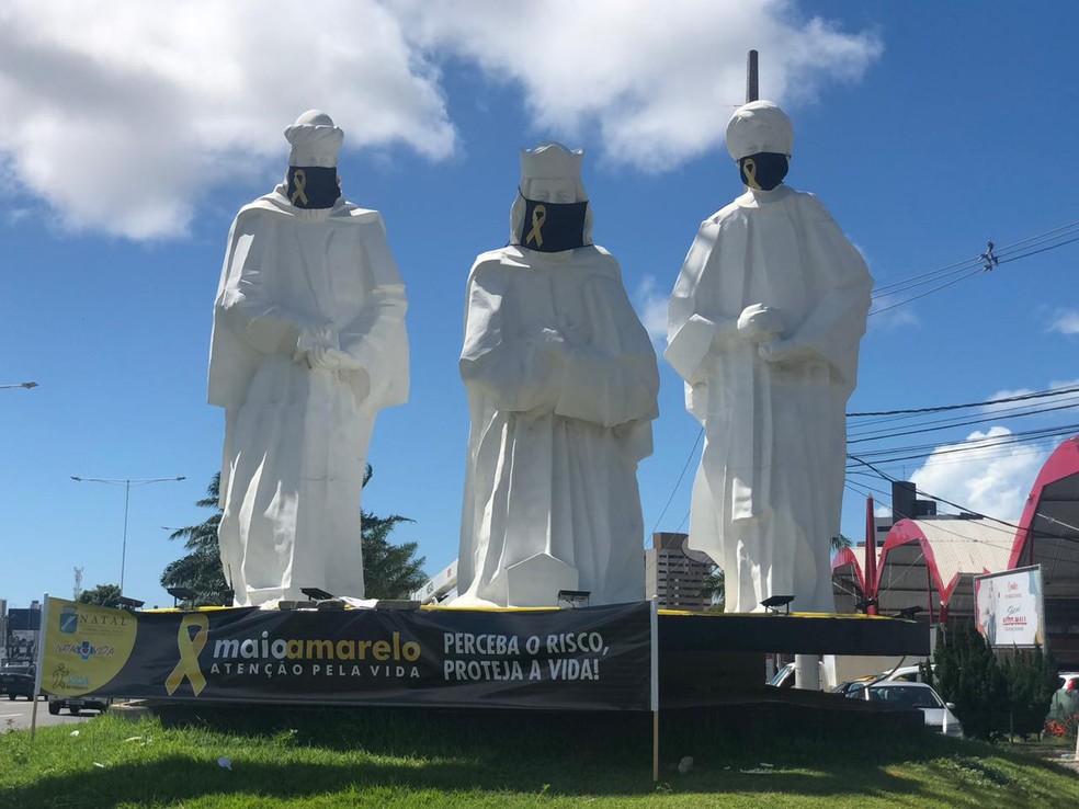 Os três Reis Magos, que dão as boas-vindas a quem chega a Natal pela BR-101, receberam máscaras em uma campanha de conscientização contra o novo coronavírus. Os acessórios foram colocados no pórtico pela Secretaria de Mobilidade Urbana (STTU), na tarde dessa terça-feira (19).