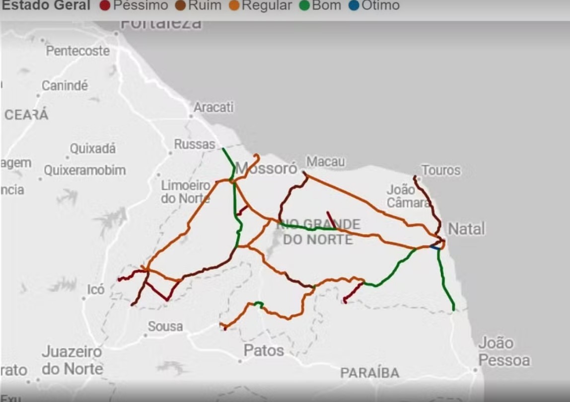 Na malha de rodovias federais e estaduais do Rio Grande do Norte, apenas 30 km são classificados com estado geral “ótimo” – todos em rodovias federais. Por outro lado, quase 650 quilômetros são ruins ou péssimos.
