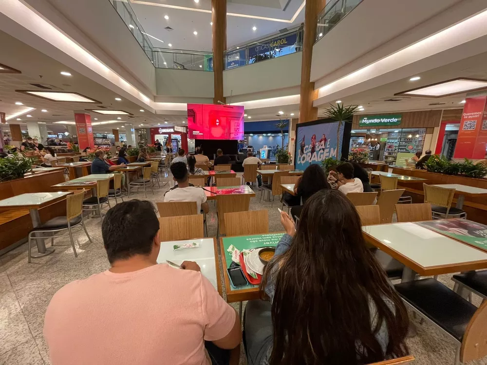 A transmissão acontece em um telão instalado na praça de alimentação do shopping.