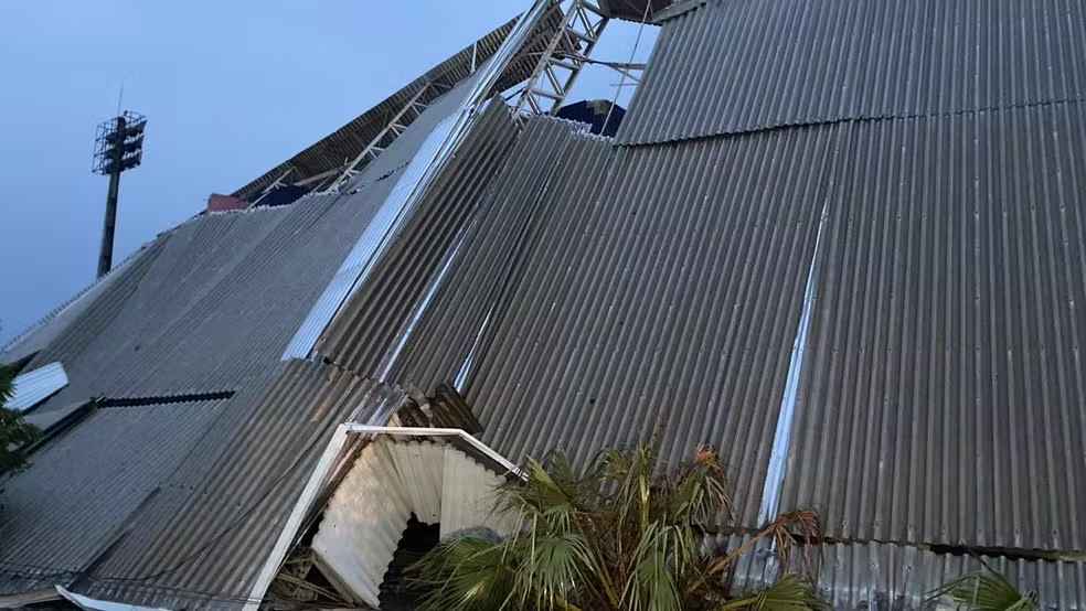 A estrutura metálica da entrada do Estádio Nogueirão, em Mossoró, desabou no fim da tarde de sábado (10), durante a chuva que atingiu a cidade.