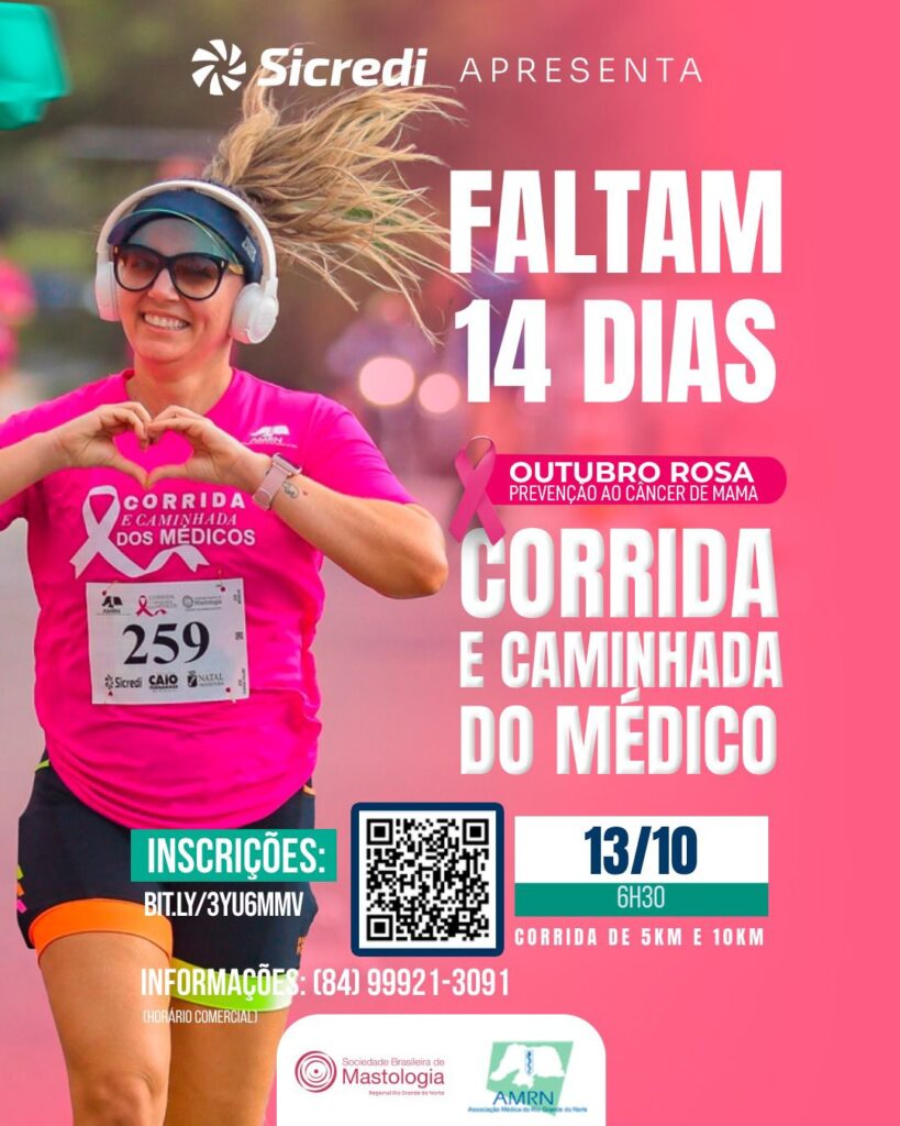 A Corrida e Caminhada do Médico ocorre dia no domingo (13) de outubro, às 6h30min da manhã, nas categorias 5km e 10km. O evento faz parte da Campanha Outubro Rosa de prevenção ao Câncer de Mama. As inscrições podem ser realizadas pelo site bit.ly/3YU6MMV.