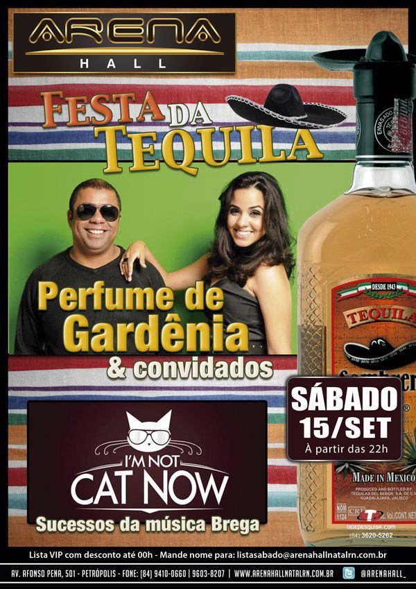 As bandas Perfume de Gardênia e I’m Not Cat Now animam a festa da Tequila, que acontece neste sábado, 15, no Arena Hall, a partir das 22h. A noite terá tequila dobrada até meia noite.