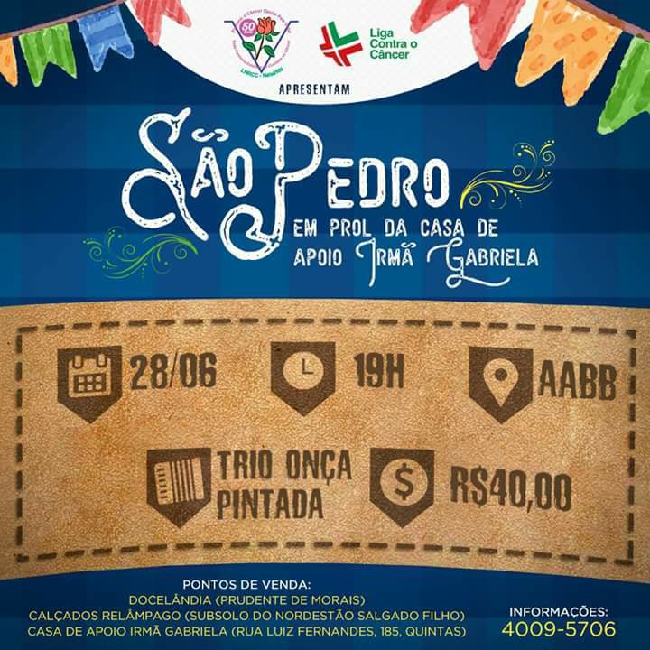 A festa de São João passou, mas o período junino ainda permite aproveitar o forró e as comidas típicas. E se for para ajudar outras pessoas, é ainda melhor. Essa é a proposta do “São Pedro em prol da Casa de Apoio Irmã Gabriela”, promovido nesta quarta-feira (28) pela Rede Feminina Estadual de Combate ao Câncer e Liga Norte Riograndense Contra o Câncer.
