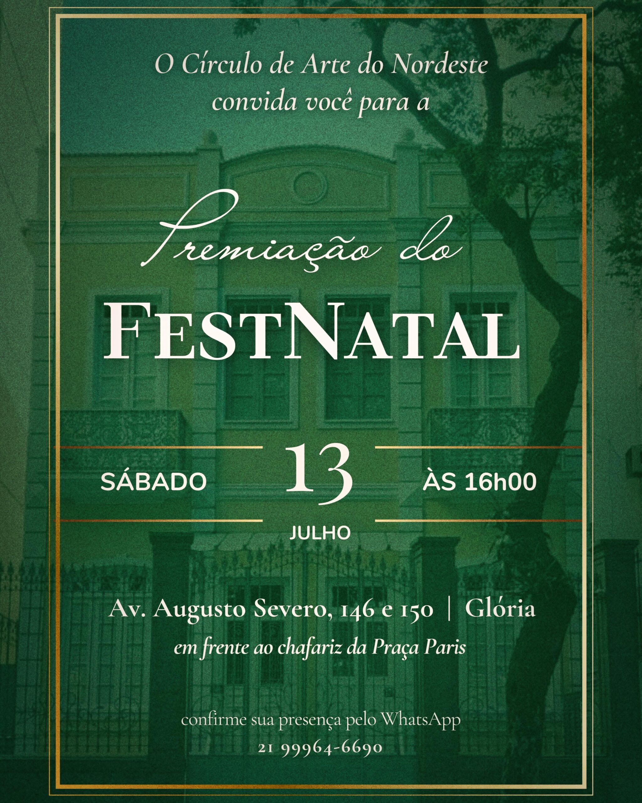 Neste sábado (13), ocorre o Festenatal, premiação que será realizada na Av. Augusto Severo, 146 e 150, em frente ao chafariz da Praça Paris.