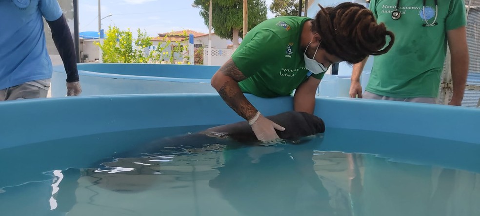 Um peixe-boi marinho com poucos dias de nascido foi resgatado após encalhar em uma praia de Macau, na região da Costa Branca potiguar. O caso aconteceu nessa quarta-feira (24), segundo o Projeto Cetáceos da Costa Branca (PCCB) da Universidade Estadual do Rio Grande do Norte, responsável pelo atendimento.