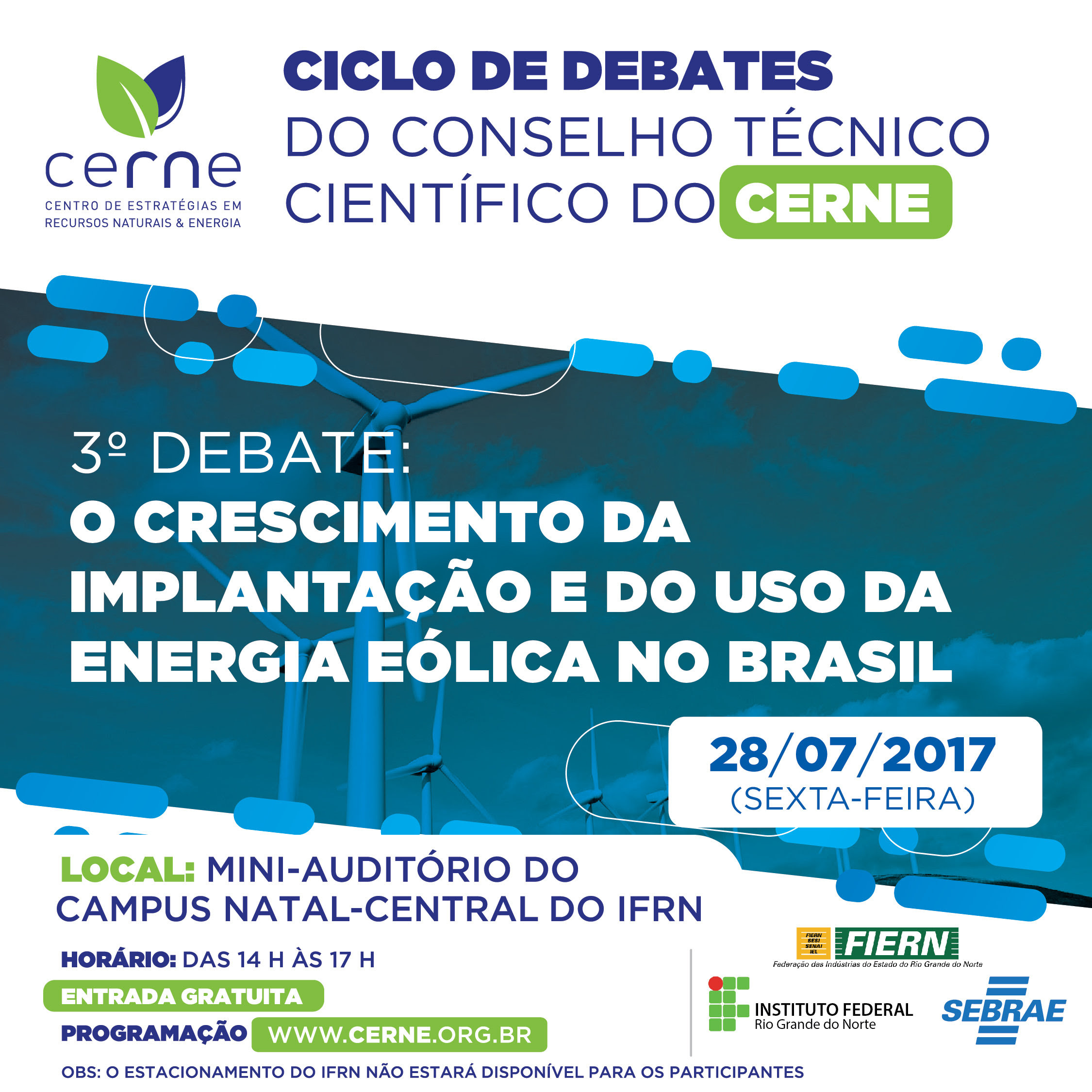 Com este cenário promissor, o crescimento da implantação e do uso da energia eólica no Brasil será o tema do terceiro encontro do Ciclo de Debates do Conselho Técnico-Científico do Centro de Estratégias em Recursos Naturais e Energia (CTC-CERNE) que será realizado dia 28 de julho, às 14 horas, no mini auditório do Instituto Federal de Educação Tecnológica do Rio Grande do Norte (IFRN) – Campus Central Natal.
